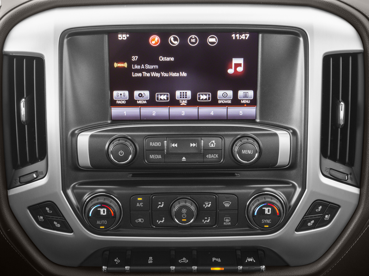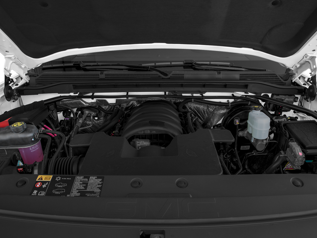 SLT PREMIUM PACKAGE includes (UQA) Bose premium audio system and (RD5) 20 x 9 polished aluminum wheels With Crew Cab model includes (BVQ) 6 rectangular chrome tubular assist steps. With Double Cab model includes (VXH) 6 rectangular chrome tubular assist steps.), SLT PREFERRED PACKAGE includes (UD5) Front and Rear Park Assist, (UVD) heated steering wheel and (A48) sliding rear window, ASSIST STEPS, CHROMED TUBULAR, 6 RECTANGULAR, SEATING, HEATED AND VENTILATED PERFORATED LEATHER-APPOINTED FRONT BUCKET, SEATS, FRONT FULL-FEATURE LEATHER-APPOINTED BUCKET with (KA1) heated seat cushions and seat backs. Includes 10-way power driver and front passenger seat adjusters, including 2-way power lumbar control, 2-position driver memory, adjustable head restraints, (D07) floor console and storage pockets. (Includes (K4C) wireless charging. AUDIO SYSTEM, 8 DIAGONAL COLOR TOUCH SCREEN NAVIGATION WITH GMC INFOTAINMENT SYSTEM, AM/FM/SIRIUSXM, HD RADIO with USB ports, auxiliary jack, Bluetooth® streaming audio for music and most phones, Pandora Internet radio and voice-activated technology for radio and phone, ENGINE, 5.3L ECOTEC3 V8, WITH ACTIVE FUEL MANAGEMENT, DIRECT INJECTION and Variable Valve Timing, includes aluminum block construction (355 hp [265 kW] @ 5600 rpm, 383 lb-ft of torque [518 Nm] @ 4100 rpm; more than 300 lb-ft of torque from 2000 to 5600 rpm) (STD), TRANSMISSION, 6-SPEED AUTOMATIC, ELECTRONICALLY CONTROLLED with overdrive and tow/haul mode. Includes Cruise Grade Braking and Powertrain Grade Braking (STD), STEERING WHEEL, HEATED, LEATHER WRAPPED with audio and cruise controls. GMC SLT with Summit White exterior and Jet Black interior features a 8 Cylinder Engine with 355 HP at 5600 RPM*.