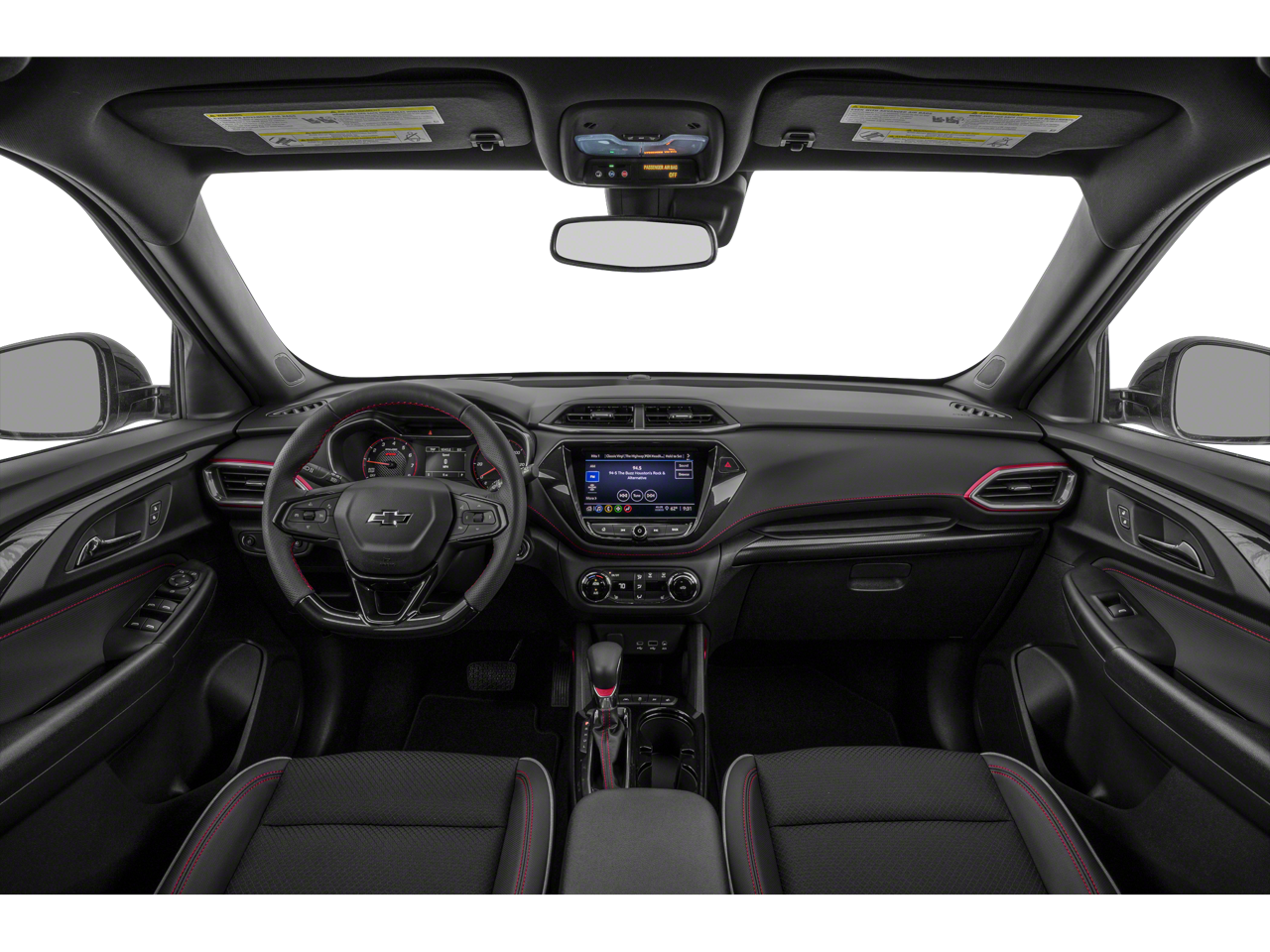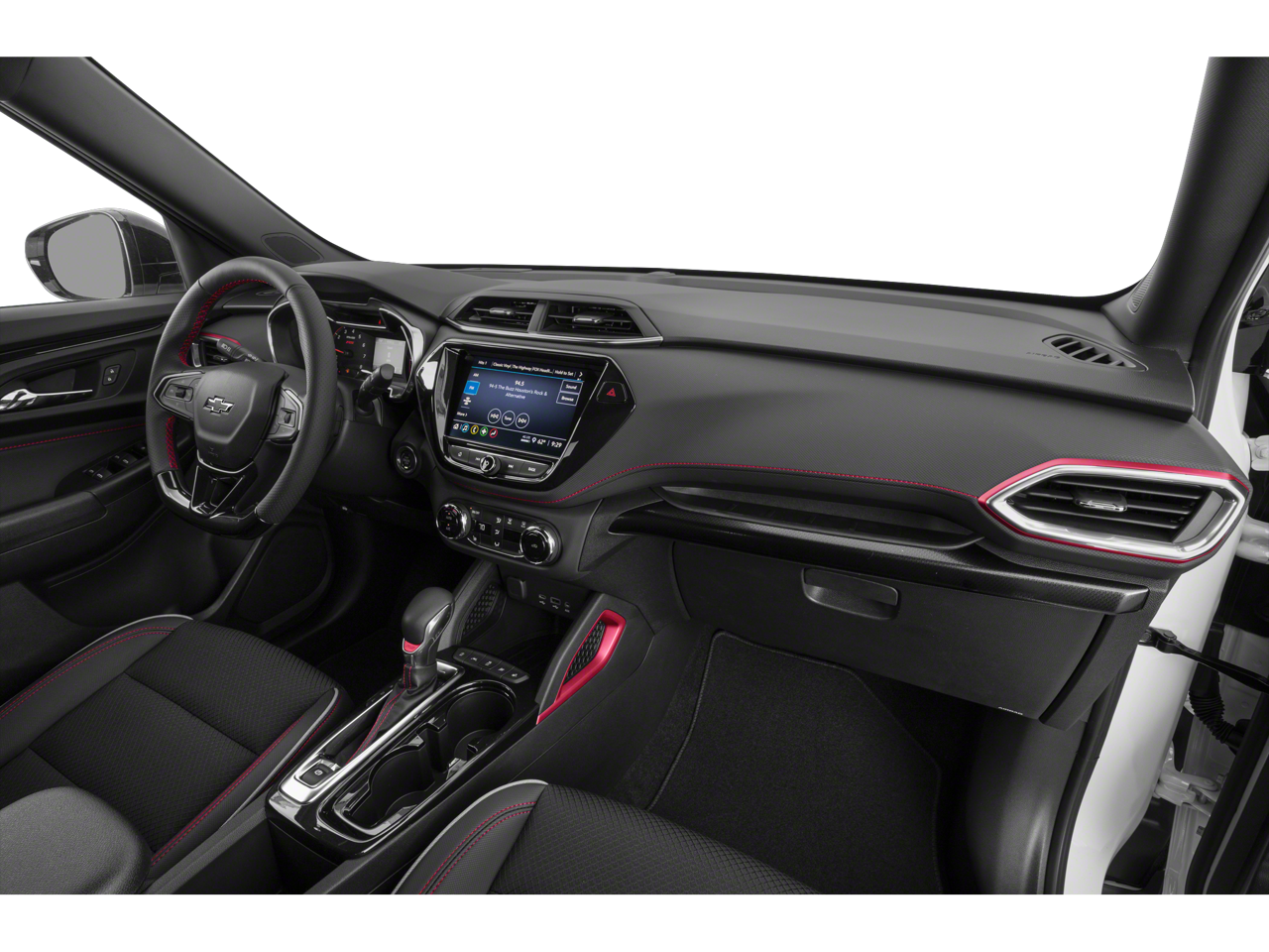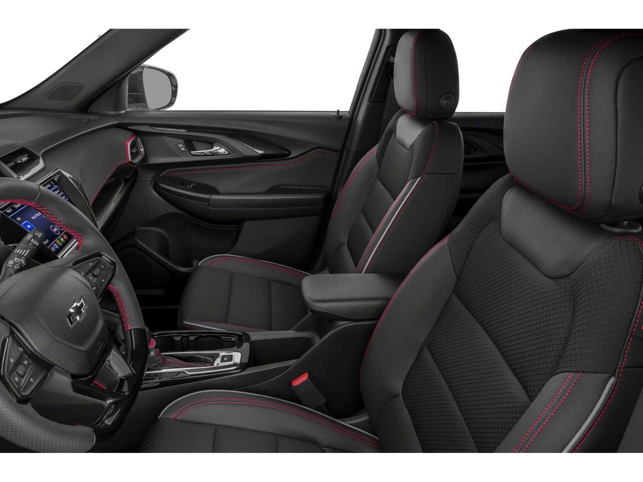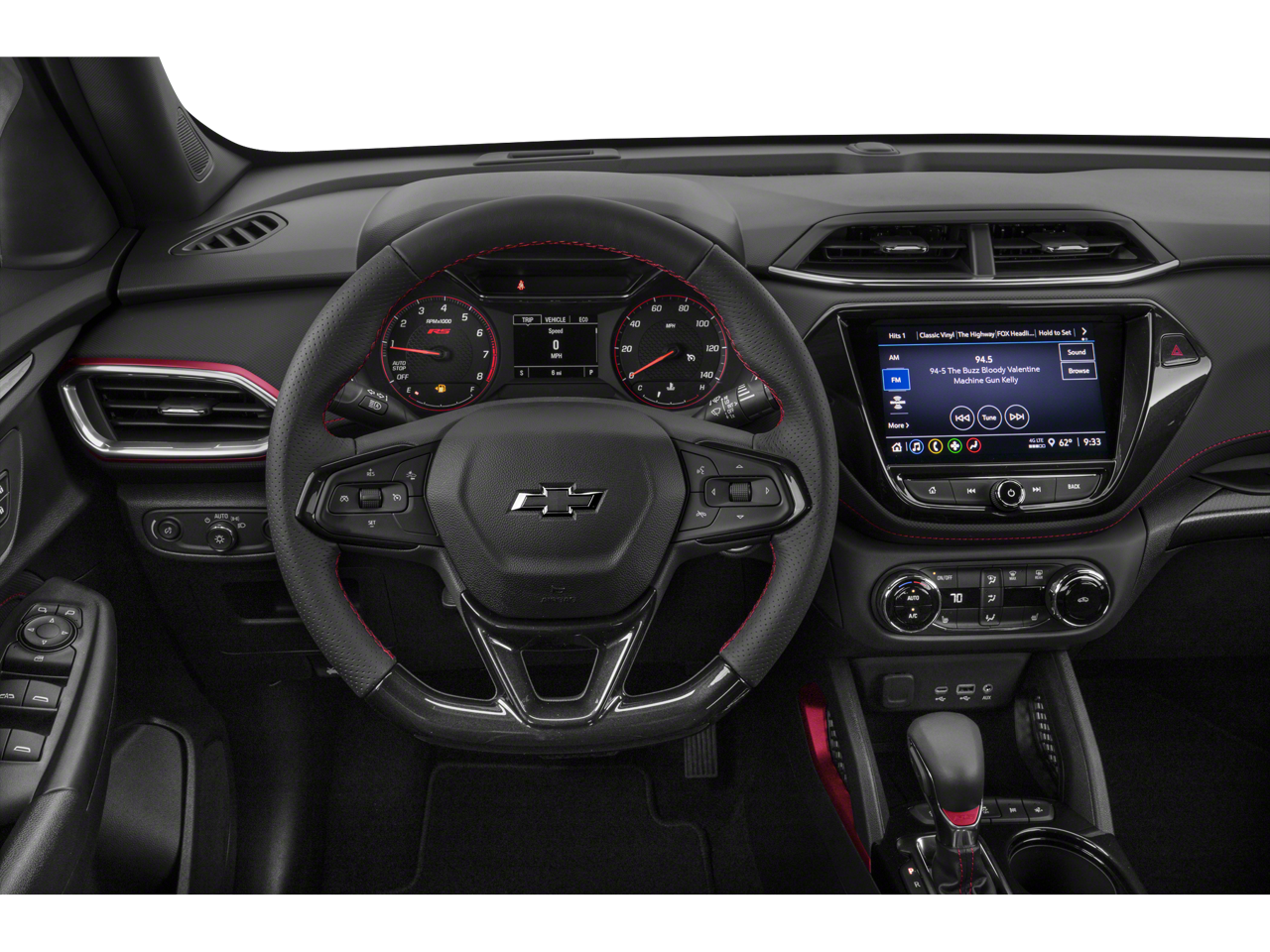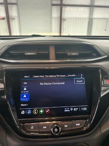 includes (C68) automatic climate control air conditioning, (UIJ) 8 diagonal color touchscreen display, (USS) one type-A and one type-C charging only USB ports, (KI6) 120-volt power outlet, (DD8) inside rearview auto-dimming mirror and (DMS) driver and front passenger illuminated vanity mirrors, covered, sliding visors, includes (UKC) Lane Change Alert with Side Blind Zone Alert, (UFG) Rear Cross Traffic Alert and (UD7) Rear Park Assist (Beginning with start of production through November 28, 2022, vehicles will be forced to include (00Y) Not Equipped with Rear Park Assist, which removes Rear Park Assist. See dealer for details or the window label for the features on a specific vehicle. Beginning December 26, 2022, certain vehicles will be forced to include (060) Not Equipped with Rear Park Assist, which removes Rear Park Assist. Does not include later dealer retrofit. See dealer for details or the window label for the features on a specific vehicle.), LPO, ALL-WEATHER FLOOR LINERS, FRONT AND REAR, 7 diagonal color touchscreen, AM/FM stereo. Additional features for compatible phones include: Bluetooth® audio streaming for 2 active devices, voice command pass-through to phone, Apple CarPlay and Android Auto capable. (8 screen when (ZL3) Convenience Package and (ZL5) Driver Confidence Package are ordered.) (STD), (155 hp [115 kW] @ 5600 rpm, 174 lb-ft torque [236 N-m] @ 1600 rpm) (STD), (STD). Chevrolet RS with Mosaic Black Metallic exterior and Jet Black with Red accents interior features a 3 Cylinder Engine with 155 HP at 5600 RPM*.